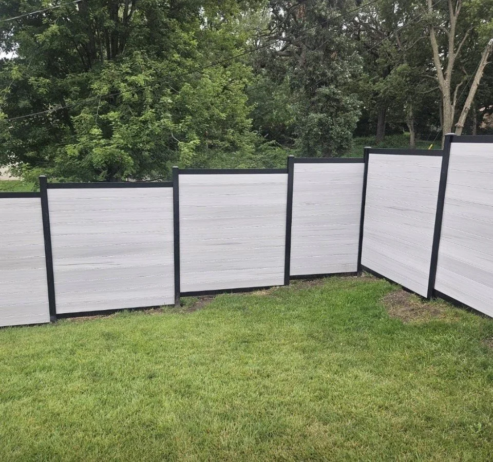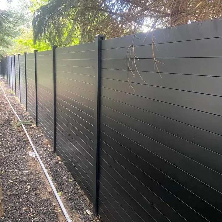 Aluminum-frame privacy fence with fill options including vinyl, composite, and cedar tongue-and-groove boards.